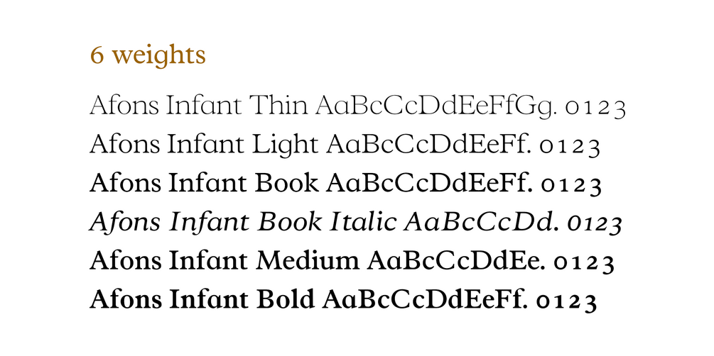 An easy-to-read, rounded typeface with a large x-height, based on Plantin, making it excellent for long-form text copy. Afons Infant Original has clear, well-defined shapes, in five weights, making it perfect for early readers.
